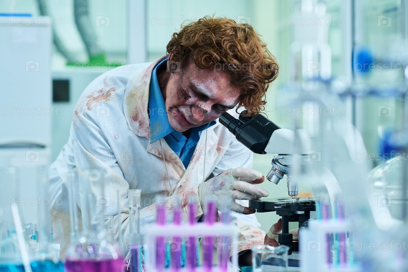 Технолог-зомби в окровавленном пальто, работающий в химической лаборатории Мужчина