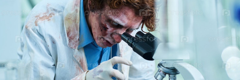 Немертвый ученый, использующий микроскоп в лабораторном заголовке