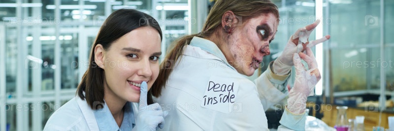 Молодая женщина шутит со своей женской коллегой-зомби Header