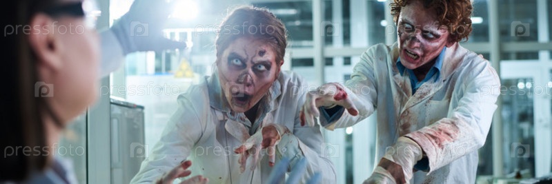 Молодые люди в костюмах зомби играют в шутки на заголовке своего коллеги