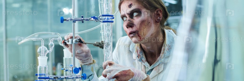 Женщина-зомби с гнилой кожей лица в лабораторном заголовке