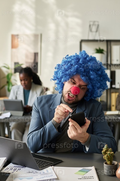 Разгневанный клоун-сотрудник указывает на экран