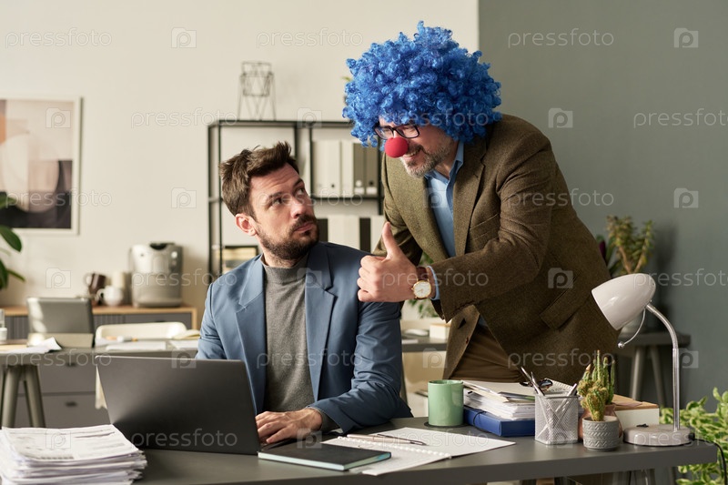 Напряженный бизнесмен смотрит на босса-клоуна