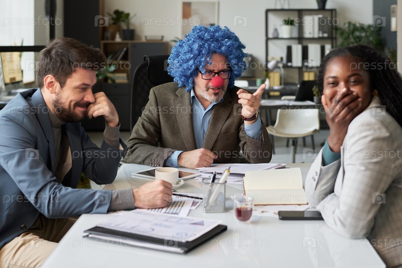 Сотрудники смеются над строгим боссом-клоуном