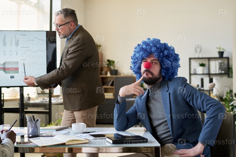 Задумчивый бизнесмен в парике клоуна