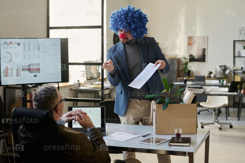 Экономист-клоун показывает бумагу боссу