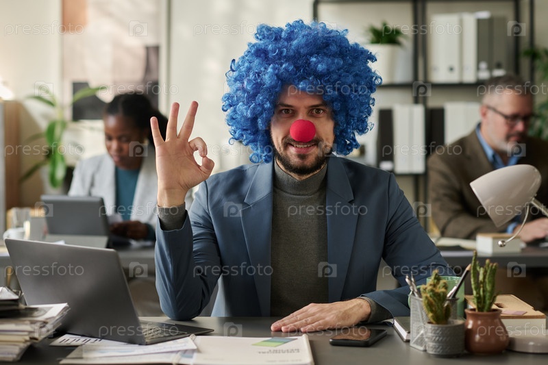 Работник-клоун показывает хороший жест