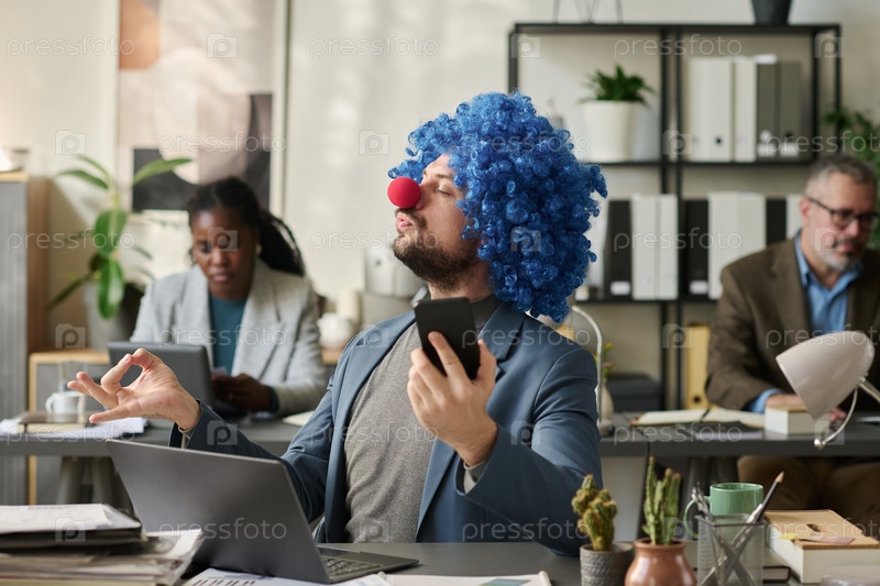 Молодой клоун-сотрудник практикует йогу