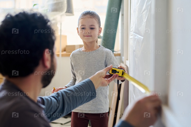 Девочка помогает отцу измерить дверной проем