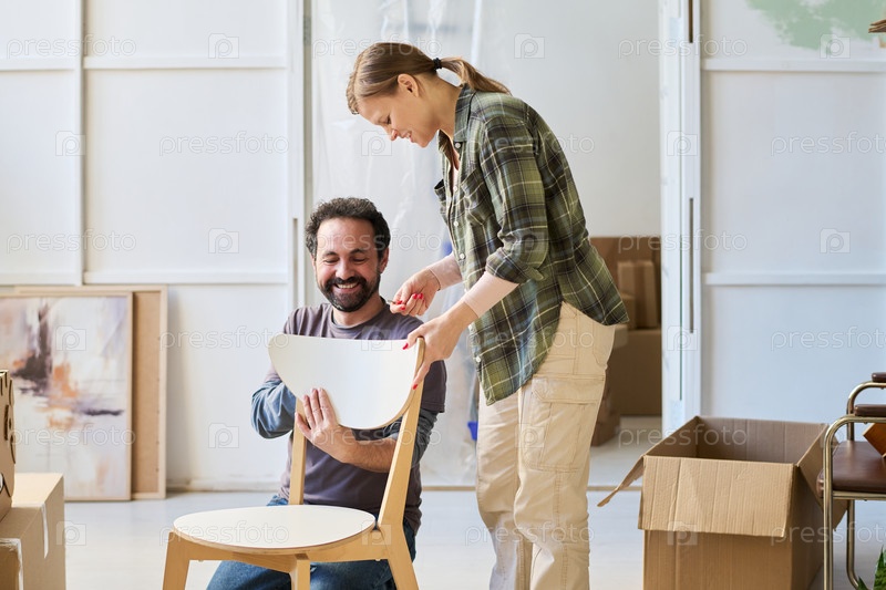 Молодая пара ремонтирует заднюю часть нового стула