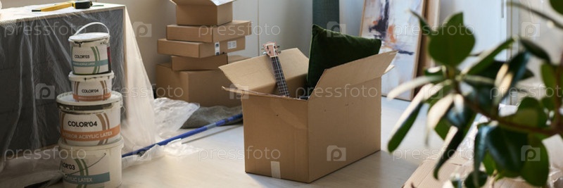 Коробка с бытовыми вещами на полу