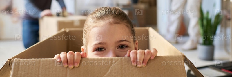 Маленькая девочка заглядывает из картонной коробки