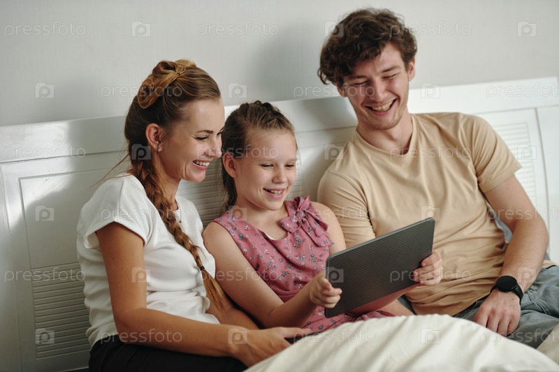 Счастливая семья, использующая цифровой планшет в постели