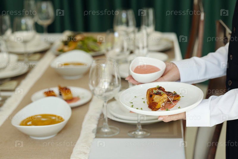 Официант ставит вкусные блюда на стол