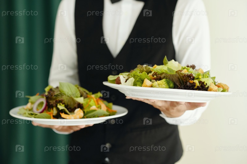 Официант устанавливает салат в ресторане