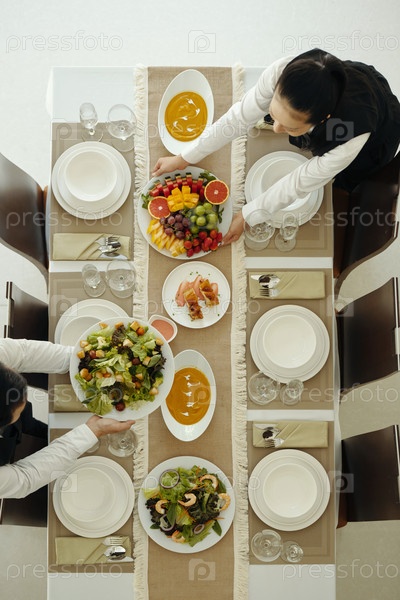 Официанты, подающие блюда во время обслуживания
