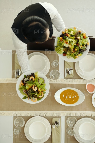 Официант устраивает салат на обеденном столе