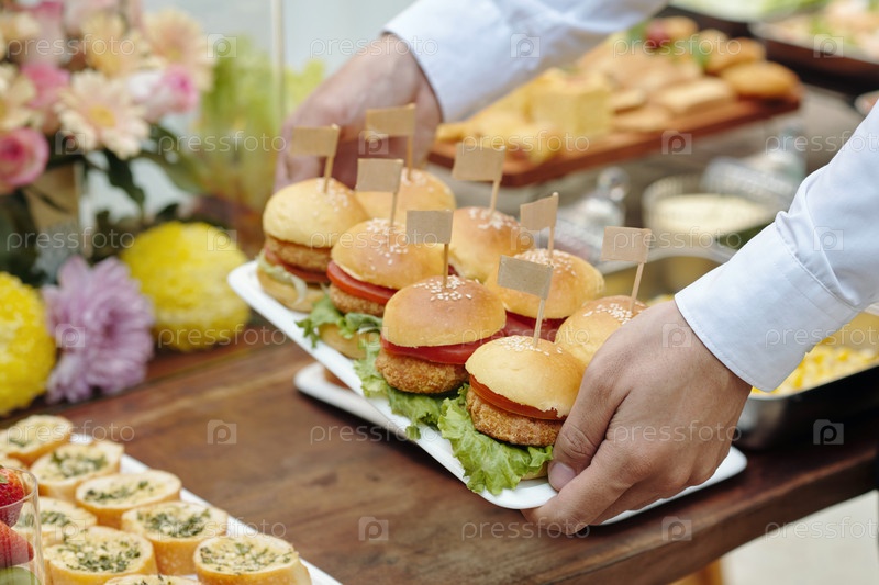 Официант подает мини-бургеры за обеденным столом