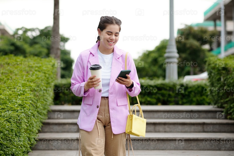 Улыбающаяся молодая женщина отправляет сообщения со смартфона на открытом воздухе