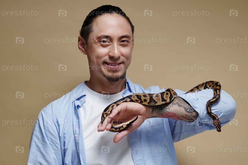 Портрет улыбающегося мужчины, держащего на руке Python Snake