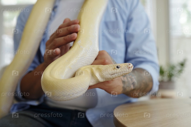 Хранение змеи альбиноса питона во время упражнения по обращению с рептилиями