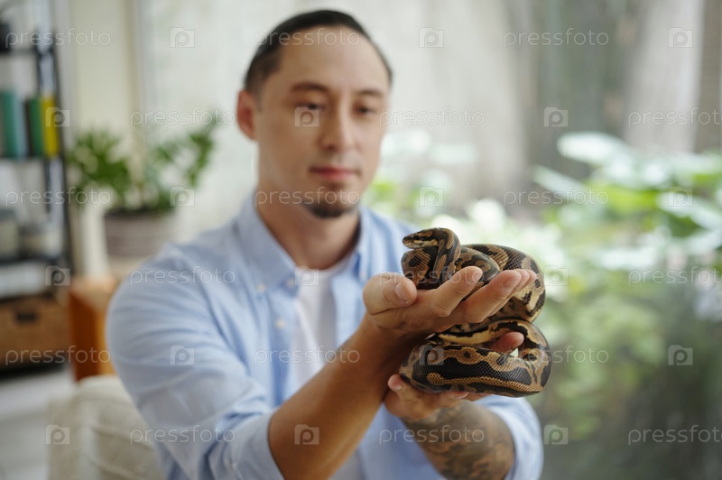 Человек, держащий питона в гостиной