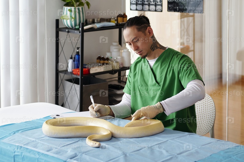 Ветеринар, осматривающий крупную змею в клинической обстановке