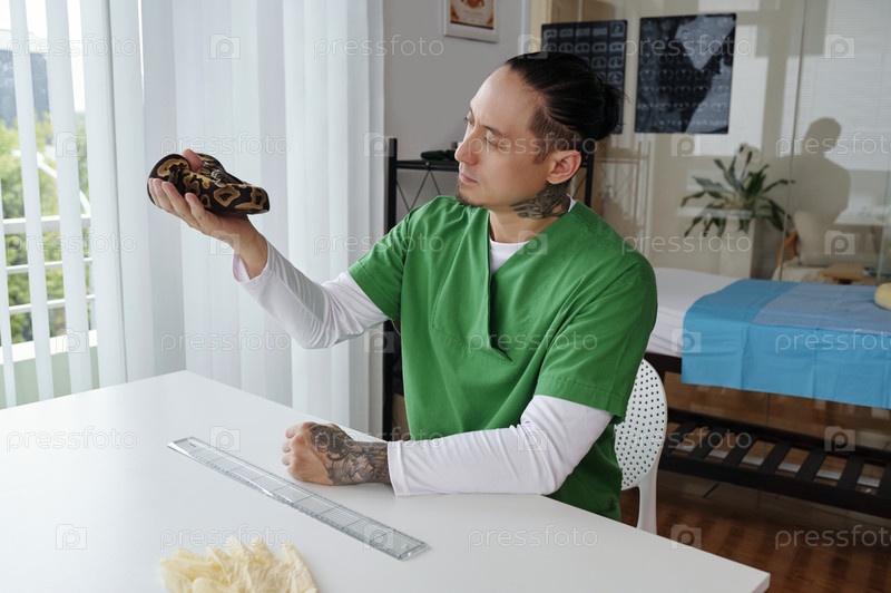 Взаимодействие с домашней змеей в комнате ветеринарной клиники