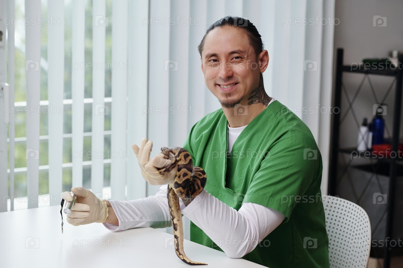 Улыбающийся мужчина-ветеринар, держащий домашнего змея в клинике