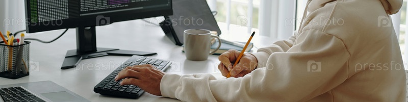 Программист делает заметки на рабочем месте