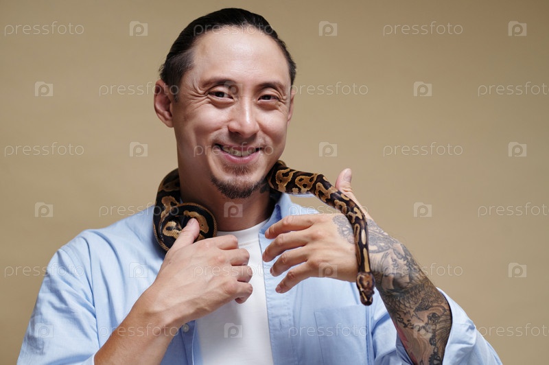 Портрет улыбающегося мужчины, держащего змею на плечах