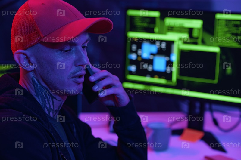 ИТ-работник обсуждает компьютерную систему по телефону