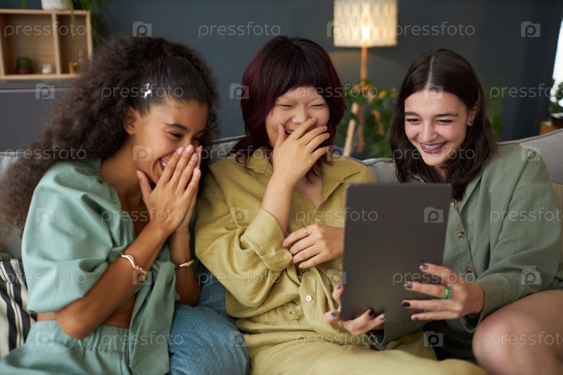 Три девушки смеются над забавным видео