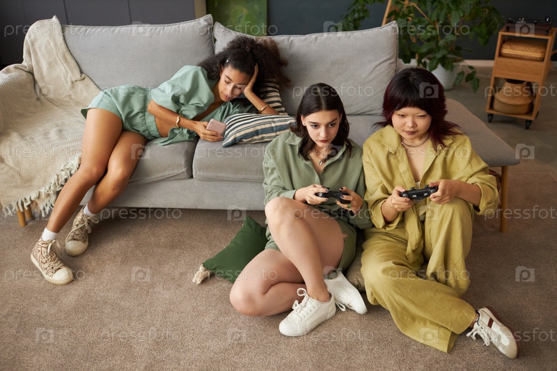 Девочки, расслабляющиеся и играющие в игру в гостиной