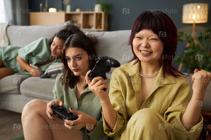 Азиатская девушка, выигравшая раунд видеоигры