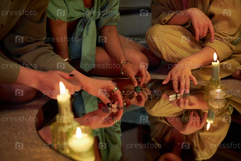 Не узнаваемые девушки, использующие зеркало и драгоценные камни на вечеринке с магической тематикой