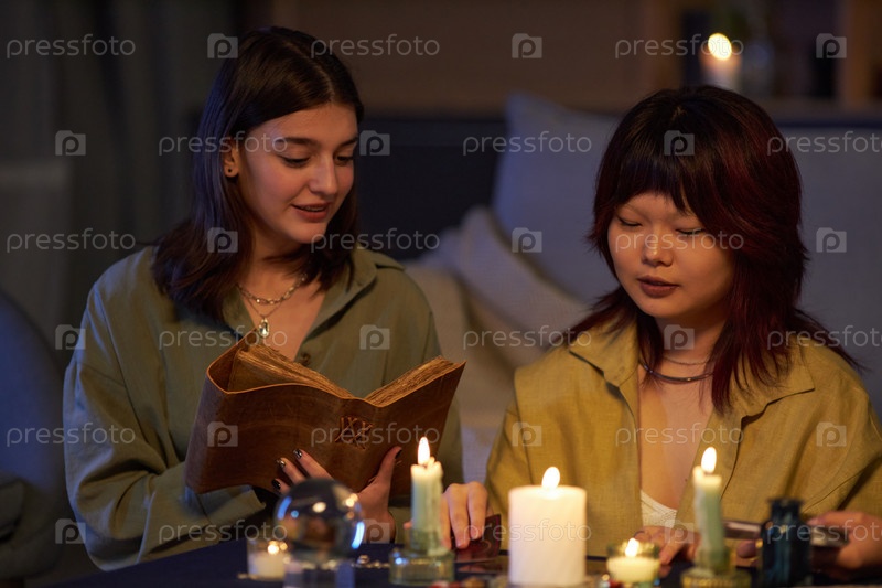 Девочки читают гримуар и карты таро