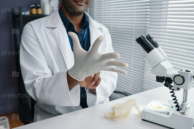 Наделение перчаток в лаборатории во время подготовки оборудования
