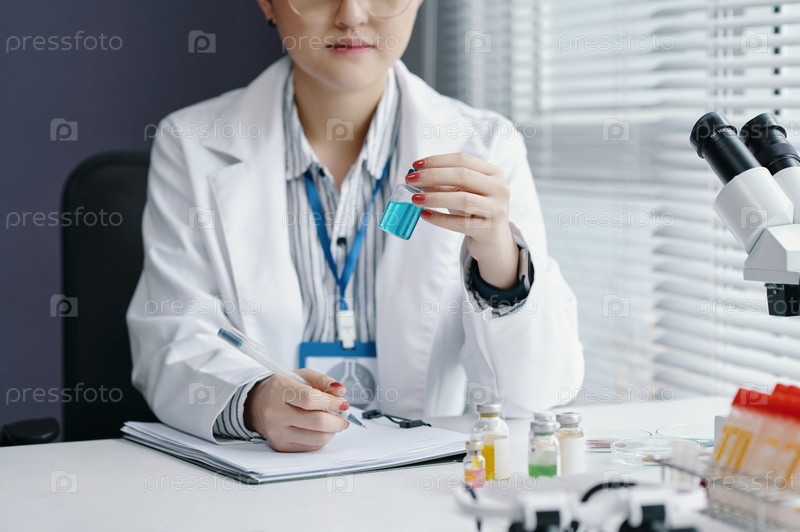 Исследование флакона с жидкостью в лаборатории ученым