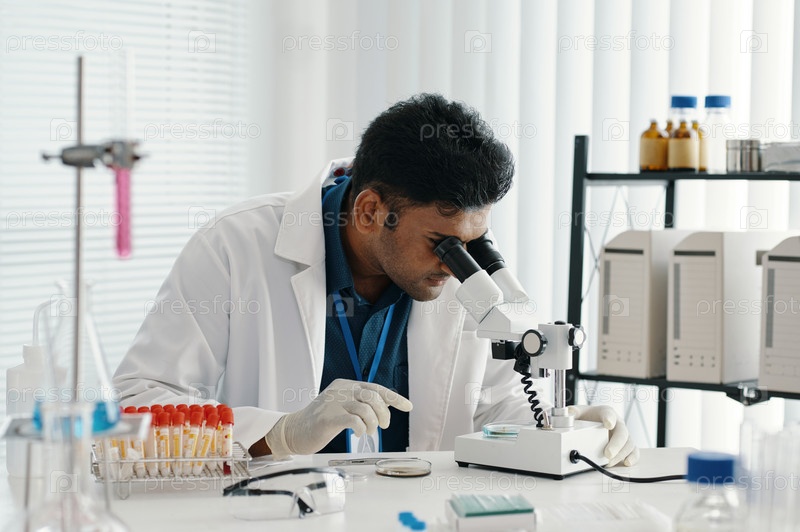 Ученый, изучающий образцы с помощью лабораторного микроскопа