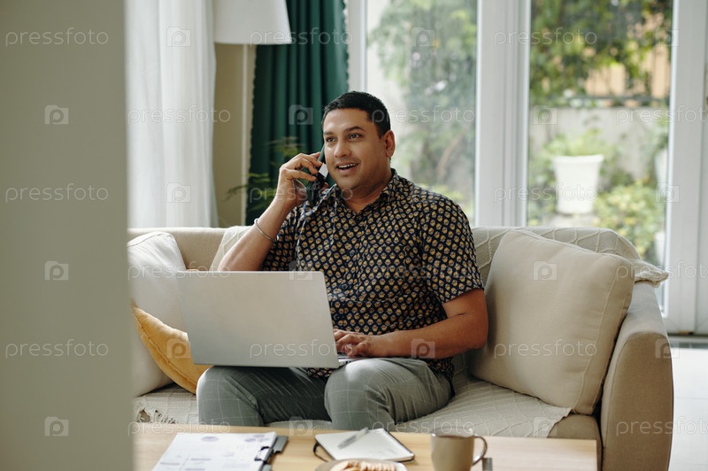 Разговор по телефону при использовании ноутбука в уютной гостиной
