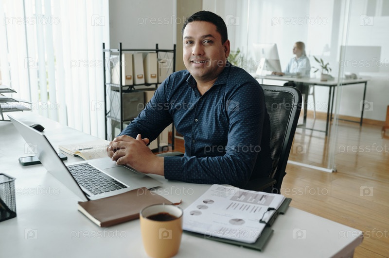 Улыбающийся мужчина сидит за офисным столом с ноутбуком и кофе