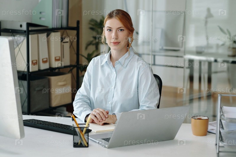 Портрет деловой женщины, сидящей за офисным столом и улыбающейся