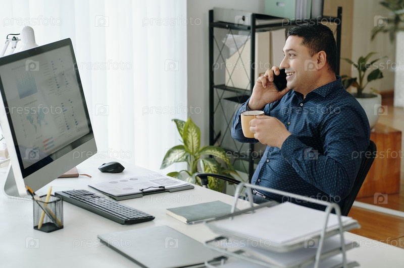 Разговор по телефону во время работы в офисе с чашечкой кофе