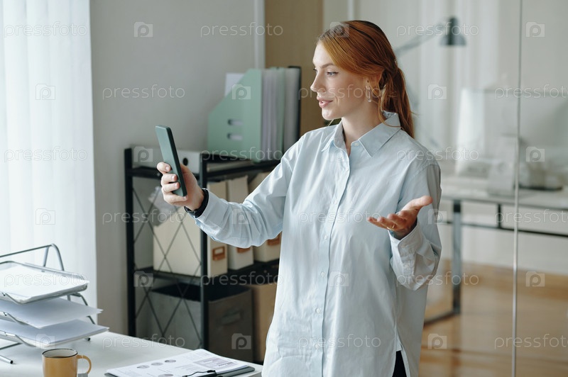 Женщина, использующая смартфон во время работы в офисном помещении