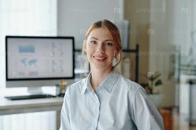Портрет улыбающейся профессиональной женщины в современном рабочем пространстве