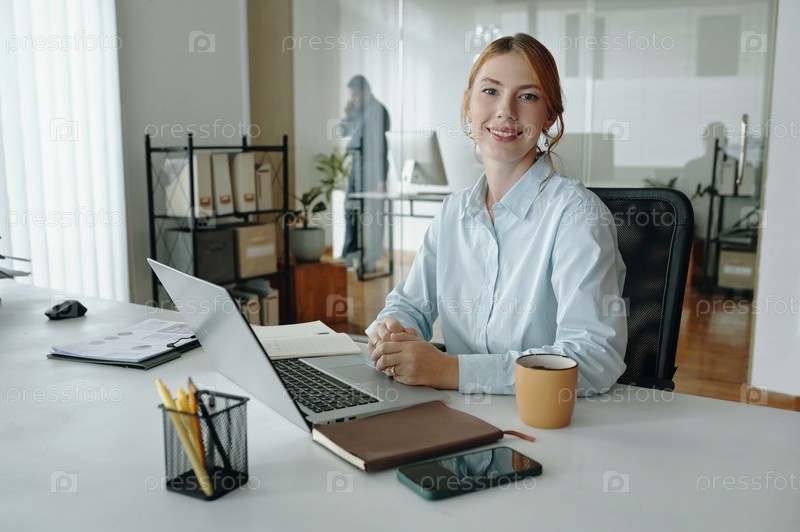Портрет улыбающейся женщины, сидящей за рабочим столом с ноутбуком