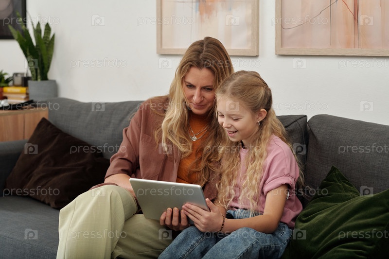 Улыбающаяся мать и дочь держат планшет смотрят видео