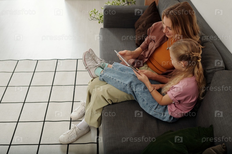 Мать и дочь сидят на диване с помощью планшета, наслаждаясь свободным временем дома