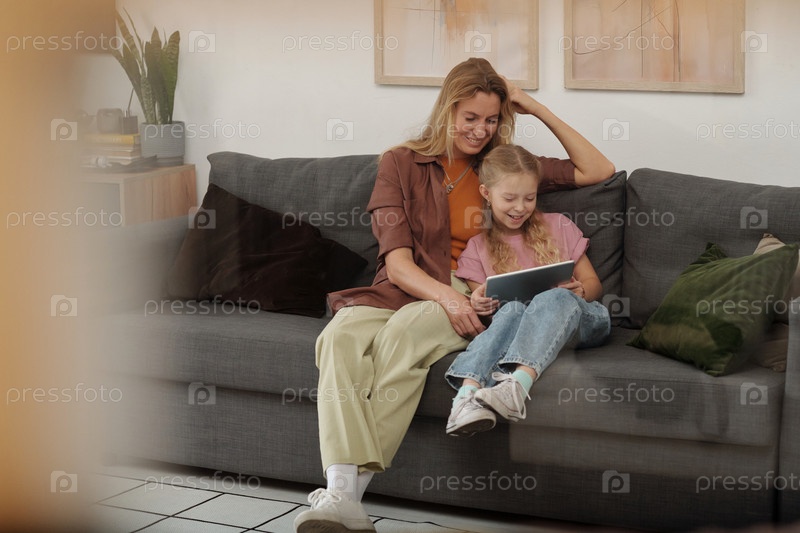 Улыбающаяся мать и дочь смотрят видео онлайн